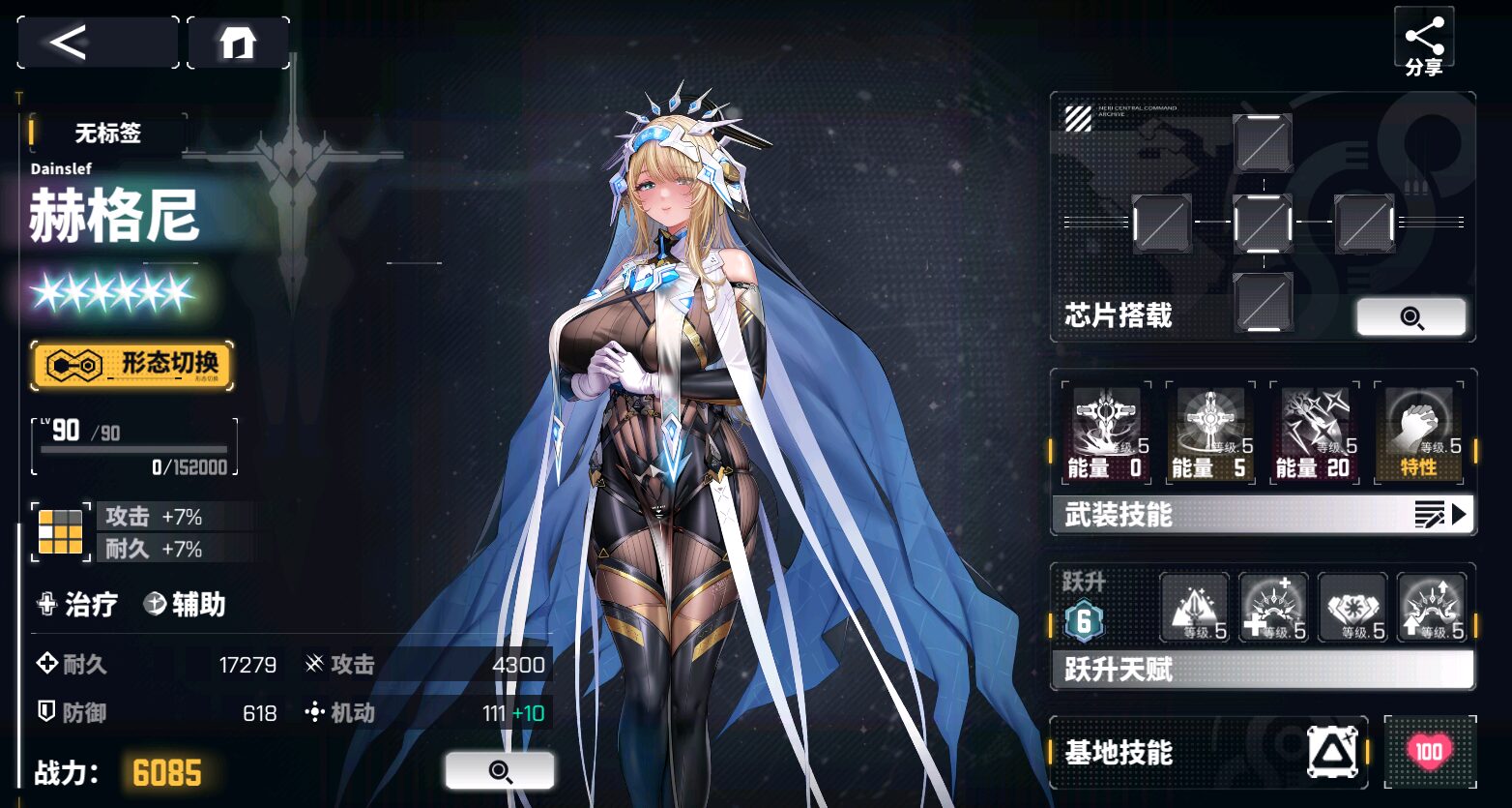 | 敵に1回の攻撃のエネルギーダメージの120%を与え、攻撃後、自分の耐久が最も低い味方ユニットを回復し、赫格尼の耐久上限の20%分を回復する |