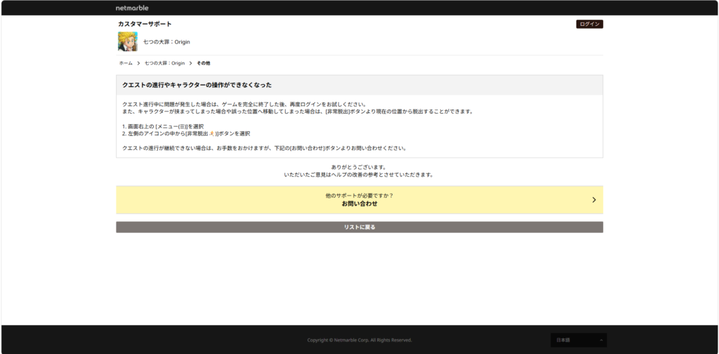 クエスト進行中に問題が発生した場合は、ゲームを完全に終了した後、再度ログインを行うか[非常脱出]ボタンを押し脱出します。上記の方法で抜けれない場合は、カスタマーサポートに連絡しましょう。