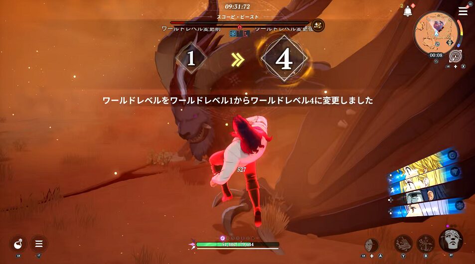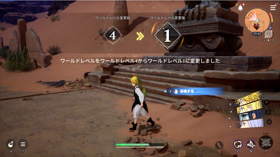 攻撃を受ける前にワールドレベルを4に戻します。攻撃を受けると戦闘中となり、ワールドレベルを変えることができません。