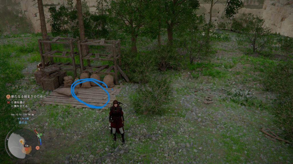 クエストが発生しているエリアにある袋を青〇のところにおきます。他のところにある袋を置いてもクエストクリアにはなりません。