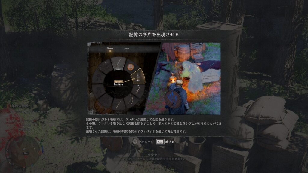 盗賊の拠点においてある木箱の近くに行くとランタンが青白く光ります。青白く光ったらランタンをつけます。