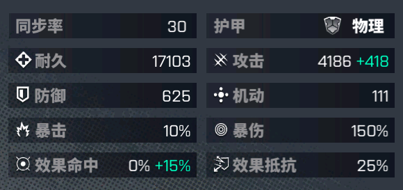 | 戦闘開始時、自身は25の同期率を得る。シンクロ状態のスキル消費同期率が40%減少する。 |